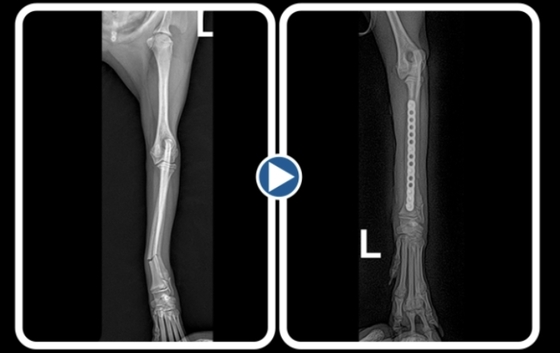 정한울 로얄동물메디컬센터 수의사는 "요척골 골절은 뼈를 외부에서 고정하는 외고정만으로 치료할 경우 변형 유합이나 불유합 위험이 높고 성장판에 영향을 줄 수 있다"며 "겉으로 단순 골절처럼 보여도 정확한 수술적 정복이 중요하다"고 설명했다.