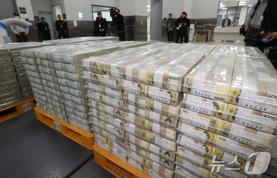 설날을 앞둔 11일 서울 중구 한국은행 본점에서 현금 운송 관계자들이 시중은행에 공급될 설 자금 방출 작업을 하고 있다. 2026.2.11 © 뉴스1 사진공동취재단