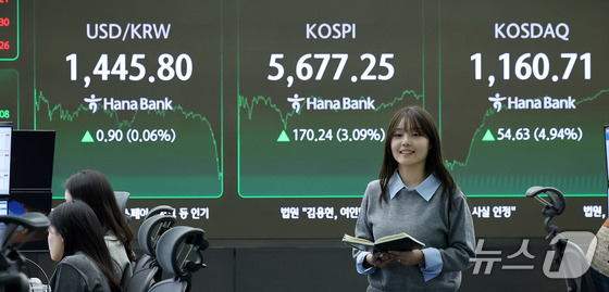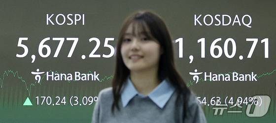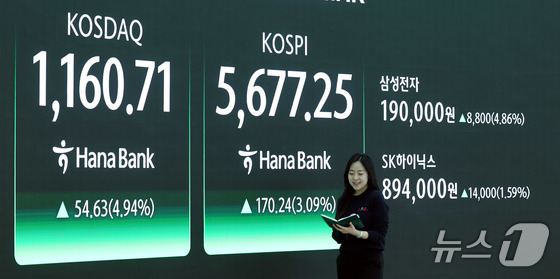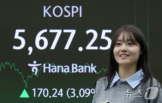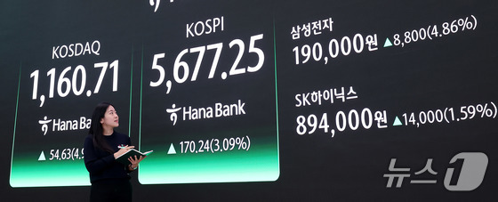 코스피가 사상 최고치로 거래를 마친 19일 오후 서울 중구 하나은행 딜링룸 전광판에 코스피 지수가 전 거래일 종가와 비교해 170.24포인트(p)(3.09%) 상승한 5677.25를 나타내고 있다. 코스닥은 전 거래일 대비 54.63포인트(p)(4.94%) 상승한 1160.71로 마감했다. 2026.2.19 © 뉴스1 박지혜 기자