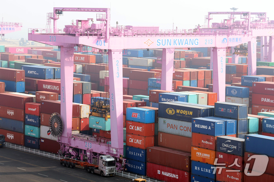 인천신항 컨테이너 터미널에 수출입 컨테이너가 쌓여 있는 모습. 2026.2.11 © 뉴스1 황기선 기자
