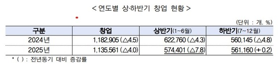 다만 하반기는 수출 강세와 내수 활성화 등의 영향으로 전년동기 대비 창업이 소폭 증가(0.2%)했다.