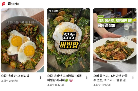 유튜브 숏폼에 다양한 봄동 레시피 영상이 검색된다.(유튜브 갈무리)