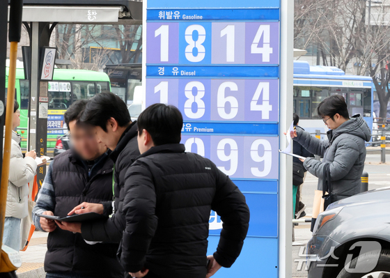 6일 오후 서울 시내 한 주유소에 유류 가격이 표시돼 있다. 정부가 국제유가 상승 국면을 틈탄 가격 담합이나 매점매석 등 불법 행위에 대해 엄정 단속에 나서겠다고 밝힌 가운데경유 가격이 휘발유 가격을 제쳤다. 이날 한국석유공사 유가정보시스템 오피넷에 따르면 이날 오전 9시 기준 전국 주유소 평균 휘발유 가격은 전날보다 22.0원 상승한 L당 1천856.3원이며, 경유 가격은 하루 만에 33.4원이 오른 1천863.7원을 기록했다. 2026.3.6 © 뉴스1 김진환 기자