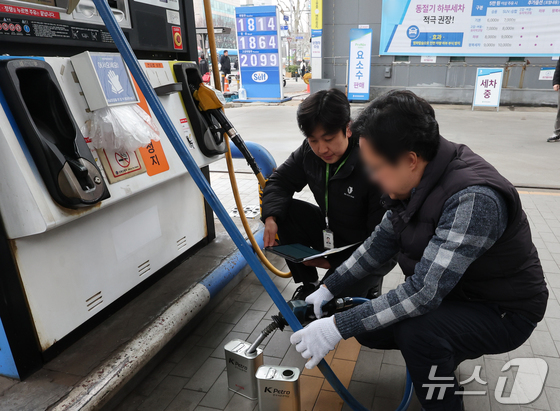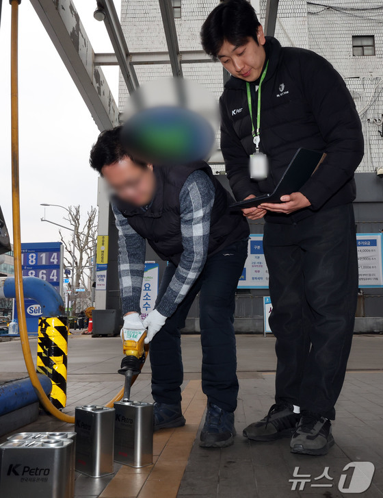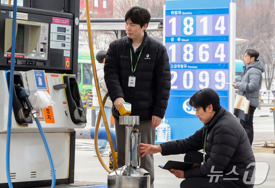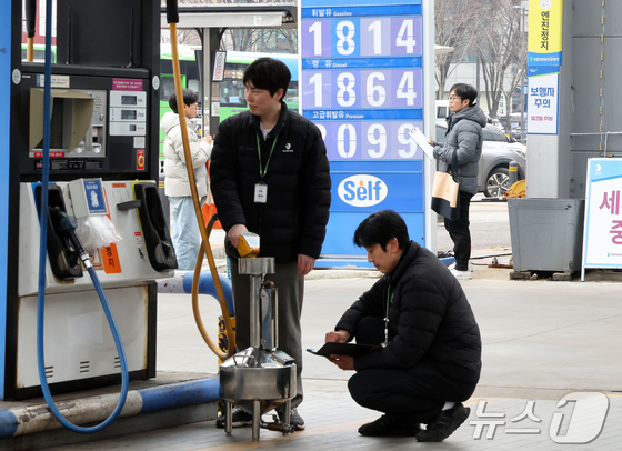 정부가 국제유가 상승 국면을 틈탄 가격 담합이나 매점매석 등 불법 행위에 대해 엄정 단속에 나서겠다고 밝힌 6일 오후 서울의 한 주유소에서 한국석유관리원 및 주유소 관계자가 품질검사를 하고 있다. 2026.3.6 © 뉴스1 김진환 기자