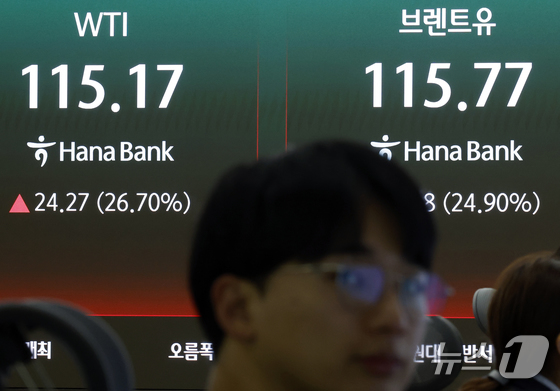 중동상황에 따른 호르무즈 해협 봉쇄 등의 영향으로 서부텍사스산중질유(WTI) 선물이 한때 30% 폭등하는 등 국제 유가가 요동친 9일 서울시 중구 하나은행 딜링룸 전광판에 서부텍사스산중질유와 브렌트유 선물 가격이 표시되고 있다. 2026.3.9 © 뉴스1 박정호 기자