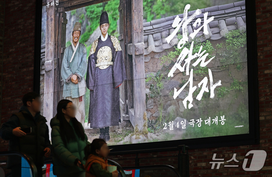 8일 서울 용산구의 한 영화관에 천만 관객을 돌파하며 흥행 질주 중인 영화 '왕과 사는 남자' 광고판이 걸려 있다. 이날 영화진흥위원회 영화관입장권 통합전산망에 따르면 영화 ‘왕과 사는 남자는 토요일인 7일 하루만에 75만 4549명의 관객을 추가하며 박스오피스 1위를 유지했다. 누적관객수는 1080만 4286명이다. 2026.3.8 © 뉴스1 오대일 기자