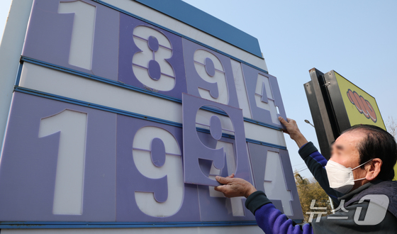 중동 전쟁 여파로 고공행진을 이어가던 주유소 기름값이 소폭 하락한 가운데 12일 오전 대전 유성구 한 주유소에서 관계자가 휘발유와 경유 가격을 조정하고 있다. 이 주유소는 휘발유 가격을 리터당 1984원에서 1894원으로 내렸다. 2026.3.12 © 뉴스1 김기태 기자