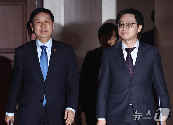 구윤철 경제부총리 겸 재정경제부 장관(왼쪽)과 김정관 산업통상자원부 장관이 12일 오후 서울 종로구 정부서울청사 영상회의실에서 열린 '민생물가 특별관리 관계장관 TF 회의'에 참석하고 있다. 2026.3.12 © 뉴스1 김민지 기자