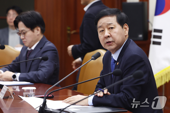 구윤철 경제부총리 겸 재정경제부 장관이 12일 오후 서울 종로구 정부서울청사 영상회의실에서 열린 '민생물가 특별관리 관계장관 TF 회의'에서 발언하고 있다. 왼쪽은 김정관 산업통상자원부 장관. 2026.3.12 © 뉴스1 김민지 기자