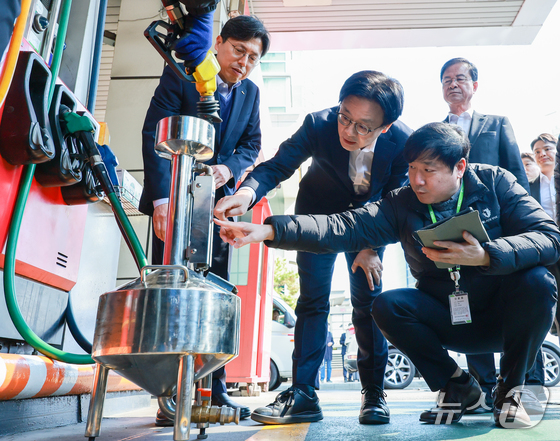김정관 산업통상부 장관이 석유 최고가격제 시행 첫날인 13일 서울 마포구 SK에너지 양지주유소를 찾아 정량기준탱크를 보며 한국석유관리원 관계자의 설명을 듣고 있다. 2026.3.13 © 뉴스1 안은나 기자