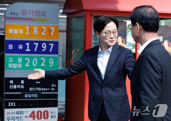 김정관 산업통상부 장관이 석유 최고가격제 시행 첫날인 13일 서울 마포구 SK에너지 양지주유소를 찾아 유가정보 등을 확인하고 있다. 2026.3.13 © 뉴스1 안은나 기자