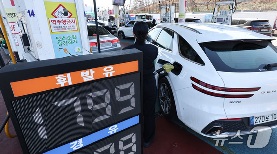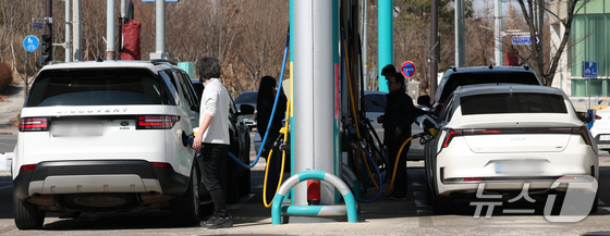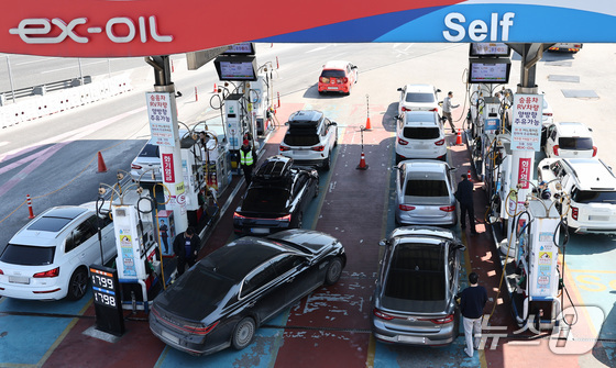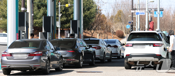 석유제품 최고가격제 시행 첫날인 13일 서울 서초구 경부고속도로 만남의광장 주유소에서 운전자들이 주유를 하고 있다. 2026.3.13 © 뉴스1 최지환 기자