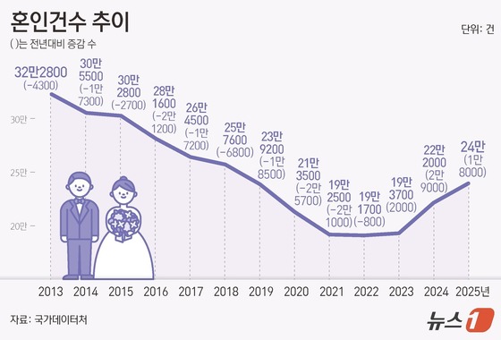 국가데이터처가 19일 발표한 '2025년 혼인·이혼 통계'를 보면 지난해 혼인 건수는 24만 건으로 전년 대비 8.1%(1만 8000건) 증가했다.