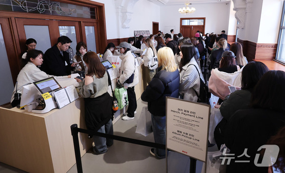 20일 서울 중구 신세계백화점 본점 헤리티지 뮤지엄에 마련된 ‘BTS POP-UP : ARIRANG’에서 아미(ARMY·팬덤명)들이 굿즈를 구입하고 있다. 2026.3.20 © 뉴스1 박지혜 기자