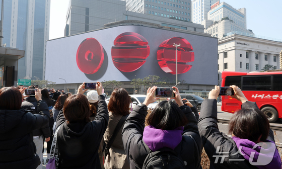 방탄소년단(BTS) 컴백 공연일인 21일 오전 서울 중구 신세계백화점 본점 신세계스퀘어에서 BTS의 컴백을 기념하는 영상이 송출되고 있다. 2026.3.21 © 뉴스1 김진환 기자