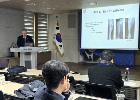 특히 이번 강의에서는 슬개골 탈구가 함께 있는 경우에도 적용할 수 있는 수술 방법이 소개됐다. 단순한 TPLO가 아닌 다양한 무릎 질환이 동시에 있는 환자(환견)에 맞춘 수술 전략이 공유되며 참석자들의 관심을 끌었다.
