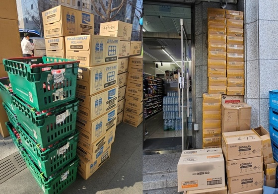 서울 종로구 광화문 인근 GS25 매장 앞에 쌓여 있는 재고들 2026.3.23 © 뉴스1 박혜연 기자