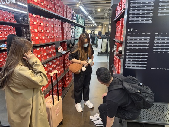 27일 여주 프리미엄 아울렛 나이키 매장에서 신발을 고르고 있는 준 일행(신세계사이먼 제공)