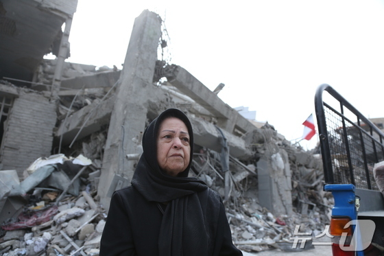 지난 12일(현지시간) 이란 수도 테헤란의 무너진 건물 앞에서 한 여성이 허망한 표정으로 서 있다.© 신화=뉴스1