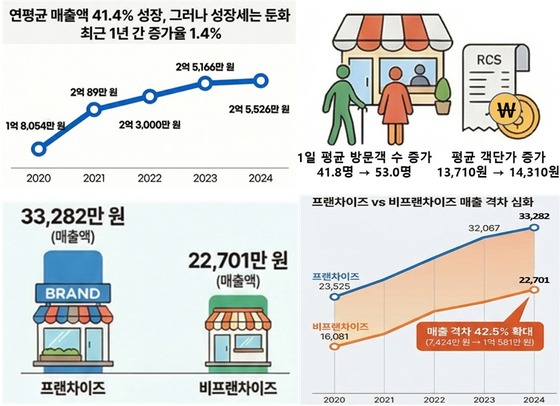 경영 형태에 따른 매출 격차도 증가했다. 2024년 프랜차이즈 업체 연평균 매출은 3억 3282만 원으로, 비프렌차이즈는 2억 2701만 원으로 1억 581만 차이가 났다. 이는 2020년의 격차 7424만 원 대비 약 42.5% 확대된 것이다.