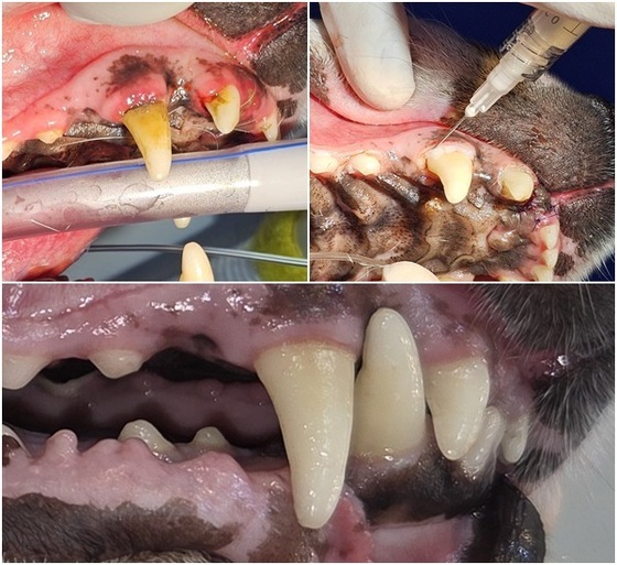 송곳니 부위 치주염이 심해(상단 왼쪽) 스케일링 시 애니씰 덴탈콜라겐을 도포하는 모습(상단 오른쪽)과 치료 후 회복된 모습(아래) (병원 제공) © 뉴스1