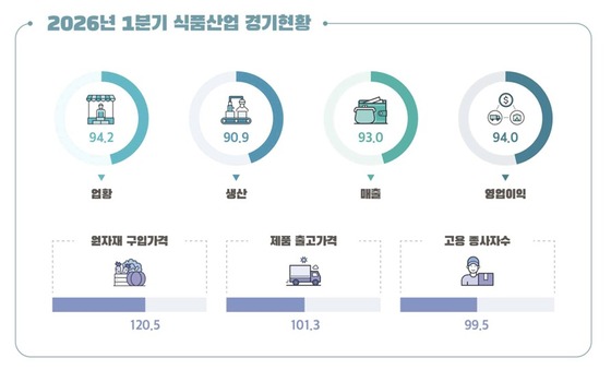 5일 한국농수산식품유통공사(aT)가 발간한 '2026년 1분기 식품산업 경기동향조사'에 따르면 올해 1분기 업계의 경기 전반 현황지수는 94.2로 기준점 100을 밑돌았다.전 분기(2025년 4분기)보다 1.5포인트(p) 상승했지만 여전히 경기 악화 체감 사업체가 여전히 많았다.