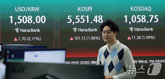 코스피와 코스닥이 동반 상승 출발한 7일 오전 서울 중구 하나은행 딜링룸 현황판에 환율·코스피·코스닥 지수가 표시되고 있다. 2026.4.7 © 뉴스1 이종수 인턴기자