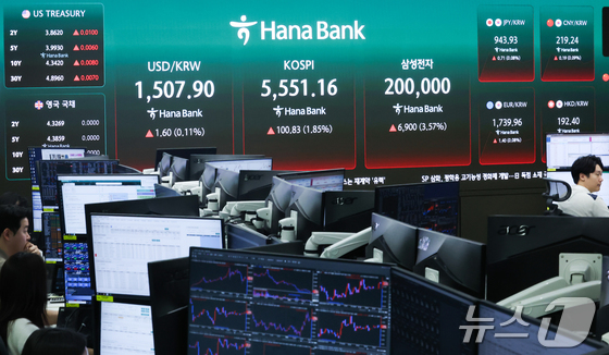 코스피와 코스닥이 동반 상승 출발한 7일 오전 서울 중구 하나은행 딜링룸 현황판에 환율·코스피·삼성전자 주가가 표시되고 있다. 2026.4.7 © 뉴스1 이종수 인턴기자
