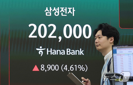 7일 오전 서울 중구 하나은행 딜링룸에서 딜러들이 업무를 보고 있다. 이날 1분기 매출 영업익 57조를 발표한 삼성전자는 3.57% 올라 '20만전자'를 탈환했다. 2026.4.7 © 뉴스1 박지혜 기자