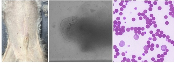 황달이 확인된 반려견의 배(맨 왼쪽), 자가 응집 반응이 확인된 혈액, 현미경으로 확인했을 때 뭉치고 있는 적혈구(SD동물의료센터 제공) © 뉴스1