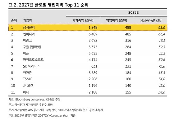 미래에셋증권은 2분기 영업이익이 76조 8000억 원을 넘어설 것으로 내다봤고, KB증권은 삼성전자가 2026년 327조 원, 2027년 488조 원의 영업이익을 기록하며 '글로벌 영업이익 1위' 기업이 될 것으로 내다봤다.