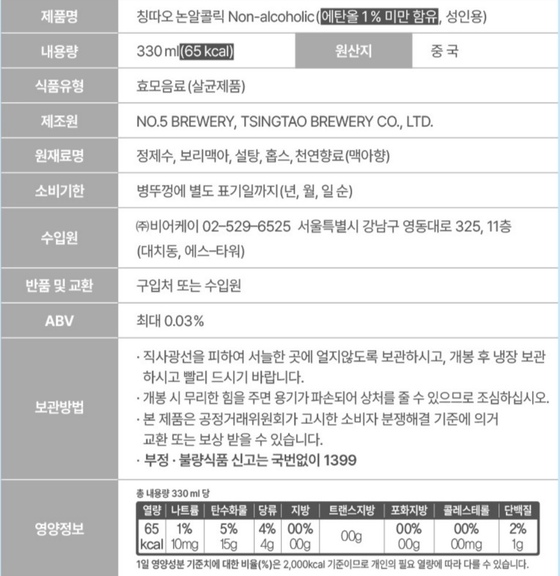 온라인에서 판매되는 칭따오 논알콜 맥주 상세 페이지에 수입사 비어케이의 주소가 실제와 다르게 기재된 것으로 확인됐다. 소비자 거래 판단에 영향을 미치는 정보인 만큼 수입사의 관리 부실이 드러났다는 지적이 나온다.
