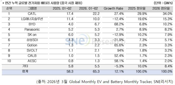 중국 CATL은 전년 동기 대비 27.4% 증가한 22.2GWh를 판매하며 글로벌 1위 자리를 지켰다. 점유율은 지난해(29.9%)보다 4.1%p 증가한 34%를 기록했다.