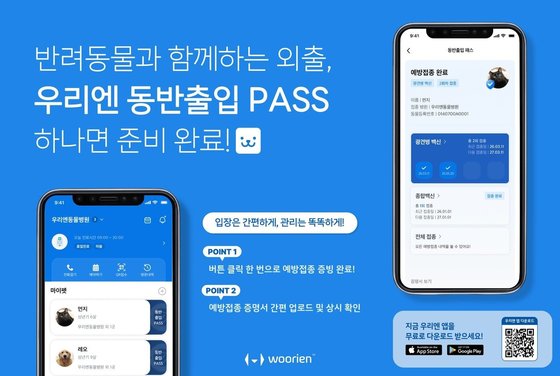 우리엔이 선보인 '동반 출입 PASS'는 앱에 등록된 반려동물 건강 데이터를 기반으로 예방접종 내역을 클릭 한 번으로 즉시 인증할 수 있다(우리엔 제공). ⓒ 뉴스1