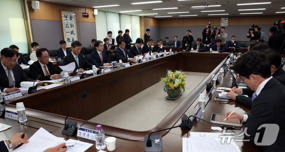 이억원 금융위원장이 7일 오후 서울 종로구 세종대로 정부서울청사에서 중동상황 피해업종 관련 산업·금융권 간담회에서 모두 발언을 하고 있다. 이날 회의에는 석유화학업계, 정유업계, 정책금융기관, 시중은행 대표등이 참석했다. 2026.4.7 © 뉴스1 김명섭 기자