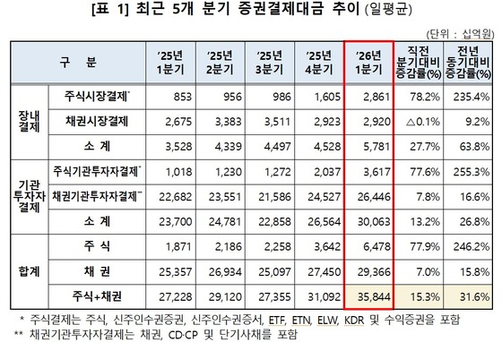 한국예탁결제원은 올 1분기 증권결제대금이 일평균 35조 8000억 원으로 직전 분기(31조 1000억 원) 대비 15.3% 증가했다고 13일 밝혔다. 전년 동기(27조 2000억 원)와 비교해선 31.6% 늘어났다.