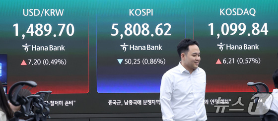 13일 서울 중구 하나은행 본점 딜링룸에 종가가 나오고 있다. 이날 코스피는 전일 종가 대비 50.25포인트(0.86%) 하락한 5808.62로, 코스닥은 전일 대비 6.21포인트(0.57%) 상승한 1099.84로 마감했다. 서울외환시장에서 달러·원 환율은 전일 오후 3시 30분 주간종가 대비 6.8원 오른 1489.2원을 기록했다. 2026.4.13 © 뉴스1 김성진 기자