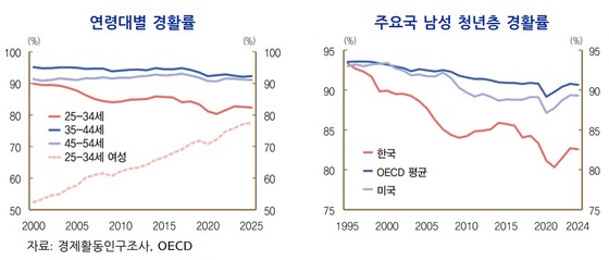 연구진은 "남성 청년층 경제활동참가율이 OECD 평균을 크게 밑도는 수준까지 빠르게 하락한 것은 성별·세대 간 경쟁 심화가 제로섬적 재분배로 귀결될 가능성을 시사한다"며 "청년층이 수월하게 노동시장에 진입할 수 있는 제도적 여건 조성이 시급하다"고 강조했다.