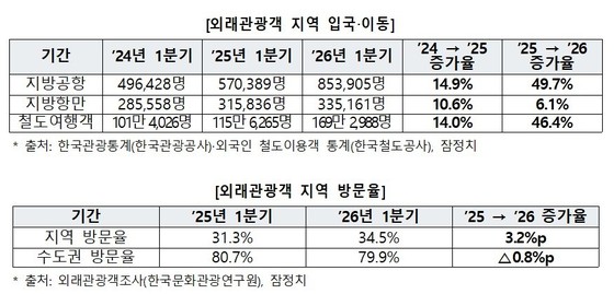 올해 1분기 지방공항을 통해 입국한 외래객은 85만 3905명으로 지난해 같은 기간(57만 389명) 대비 49.7% 급증했다. 철도를 이용한 외국인 여행객 또한 전년 대비 46.4% 증가한 약 169만 명에 달했다. 이에 따라 방한 외국인의 지역 방문율은 34.5%를 기록하며 전년 대비 3.2%포인트(p) 상승했다.