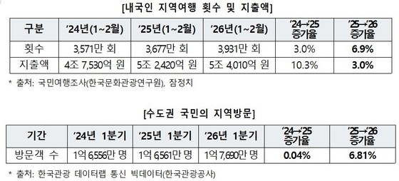 올해 1~2월 내국인의 지역여행 횟수는 3931만 회를 기록하며 지난해 같은 기간 대비 6.9% 늘어났다. 같은 기간 지역여행 지출액은 전년 대비 3.0% 증가해 5조 4010억 원 규모로 집계됐다. 특히 수도권 거주 국민의 지역 방문객 수는 전년 동기 대비 6.81% 증가한 1억 7690만 명을 기록했다.