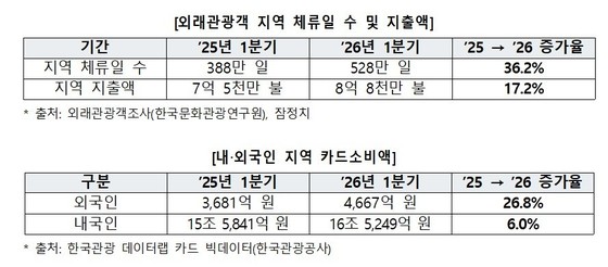 14일 문화체육관광부에 따르면 지역 방문 외국인 수부터 체류 기간, 소비액까지 2026년 1분기 지역관광 전반에서 각종 수치가 상승세를 보이며 지역관광 활성화의 청신호가 켜졌다.