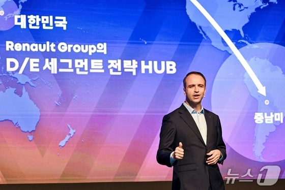 니콜라 파리 르노코리아 대표이사 사장이 14일 오전 서울 용산구 그랜드 하얏트 호텔에서 열린 기자 간담회에서 신차 개발 계획에 대해 발표하고 있다(르노코리아 제공). 2026.4.14.