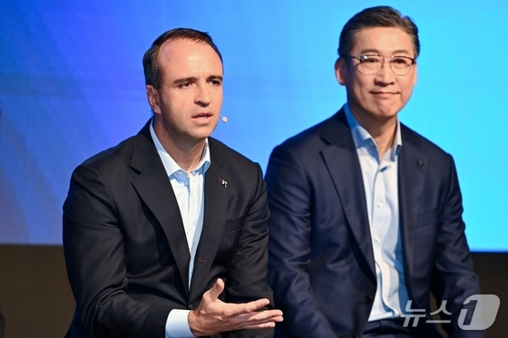 니콜라 파리 르노코리아 대표이사 사장(왼쪽)과 최성규 르노코리아 연구개발 고문이 14일 오전 서울 용산구 그랜드 하얏트 호텔에서 열린 기자 간담회에서 신차 개발 계획에 대한 취재진의 질문에 답변하고 있다(르노코리아 제공). 2026.4.14.