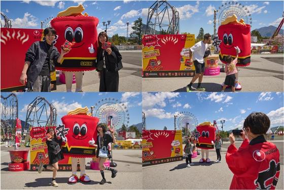 후지큐 하이랜드 방문객들이 신라면 캐릭터 '신'(SHIN)과 기념사진을 찍고 있다.(농심 제공)