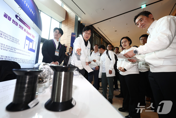 한성숙 중소벤처기업부 장관이 1일 오후 서울 영등포구 콘래드 서울 호텔에서 열린 모두의 챌린지 AX 출범식에서 공장 현장 챗봇 AI 에이전트 부스를 둘러보고 있다. 2026.4.1 © 뉴스1 김민지 기자