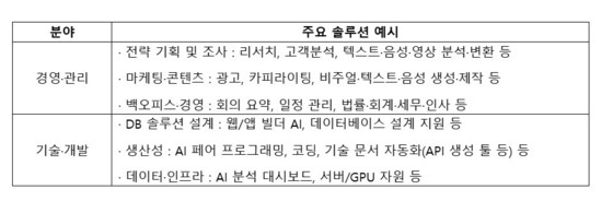 AI 설루션은 창업 도전자의 아이디어 검증과 서비스 구현을 지원하는 핵심 수단으로 활용된다. 실패 가능성을 낮추고 빠른 시장 진입을 돕는 ‘사업화 도구’ 역할을 한다는 설명이다.