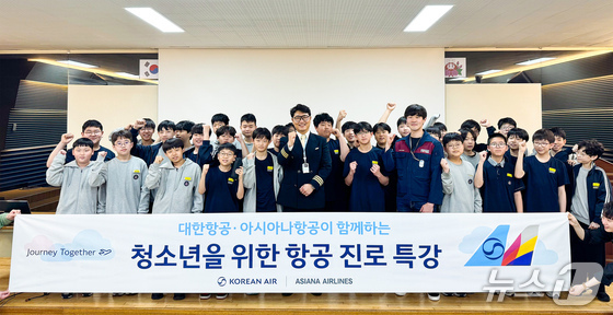 대한항공과 아시아나항공 교육기부 봉사단이 지난 16일 오전 서울 강남구 중동중학교에서 운항승무원·정비사 직업 특강을 진행한 후 기념사진을 촬영한 모습(자료사진. 대한항공 제공). 2026.4.16.