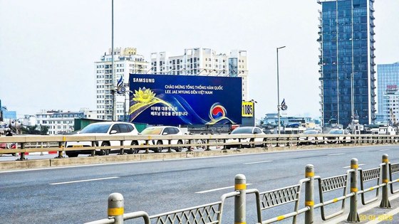이 대통령은 22일 베트남에 도착, 국빈 방문 공식 일정을 시작했다. 이에 맞춰 삼성전자 베트남 현지법인은 하노이 노이바이 국제공항 인근과 도심 주요 교통 거점에 대형 옥외광고를 세웠다. 공항에서 도심으로 향하는 주요 동선에 환영 메시지를 배치했다.