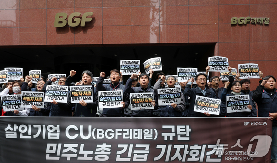 21일 오후 서울 강남구 BGF리테일 본사 앞에서 민주노총 조합원들이 ‘살인기업 CU 규탄 기자회견’을 열고 연좌농성 중 소속 노동자가 대체차량에 치여 사망한 화물연대 사상사고와 관련해 원청 책임 인정과 책임자 처벌을 촉구하고 있다. © 뉴스1 조연우 인턴기자