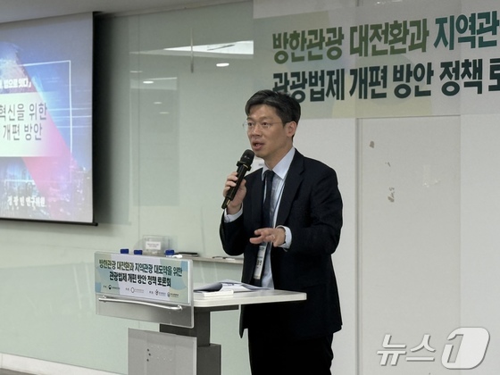정광민 한국문화관광연구원 연구위원이 23일 오후 서울 중구 한국관광공사 서울센터에서 '관광 법제 개편 방안 정책토론회'에서 발표를 하고 있다. © 뉴스1 윤슬빈 관광전문기자